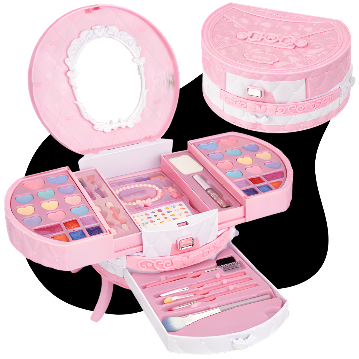 Com quatro bandejas deslizantes e três compartimentos, a maleta oferece amplo espaço para organizar todos os itens de maquiagem. As cinco seções permitem que as pequenas explorem diferentes combinações de cores e estilos, desenvolvendo suas habilidades enquanto brincam.